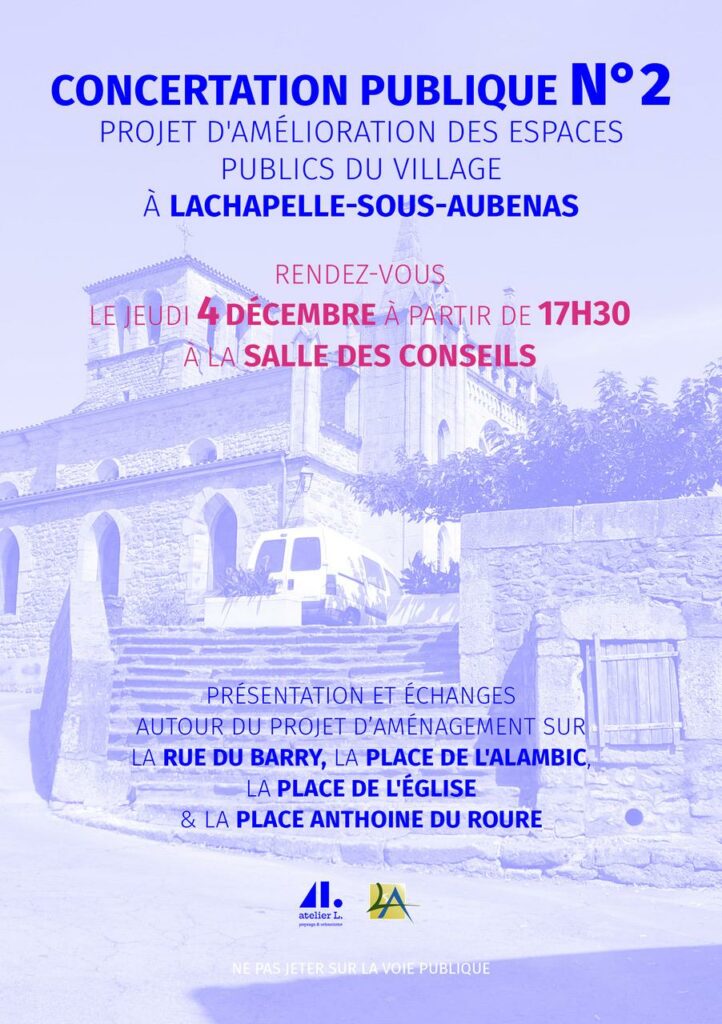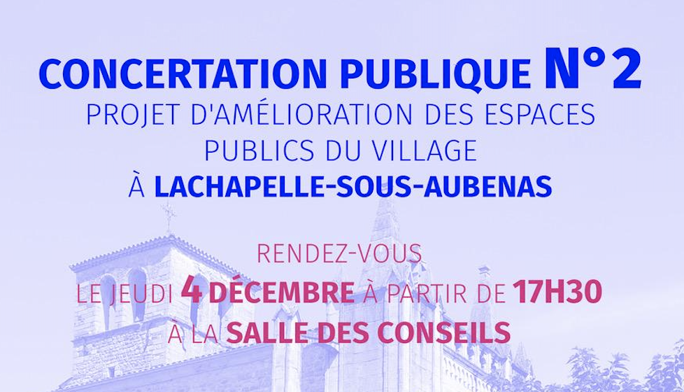Rendez-vous le jeudi 4 décembre à partir de 17h30 à la salle des conseils de Lachapelle-sous-Aubenas pour la concertation publique n°2 concernant le projet d’amélioration des espaces publics du village.
